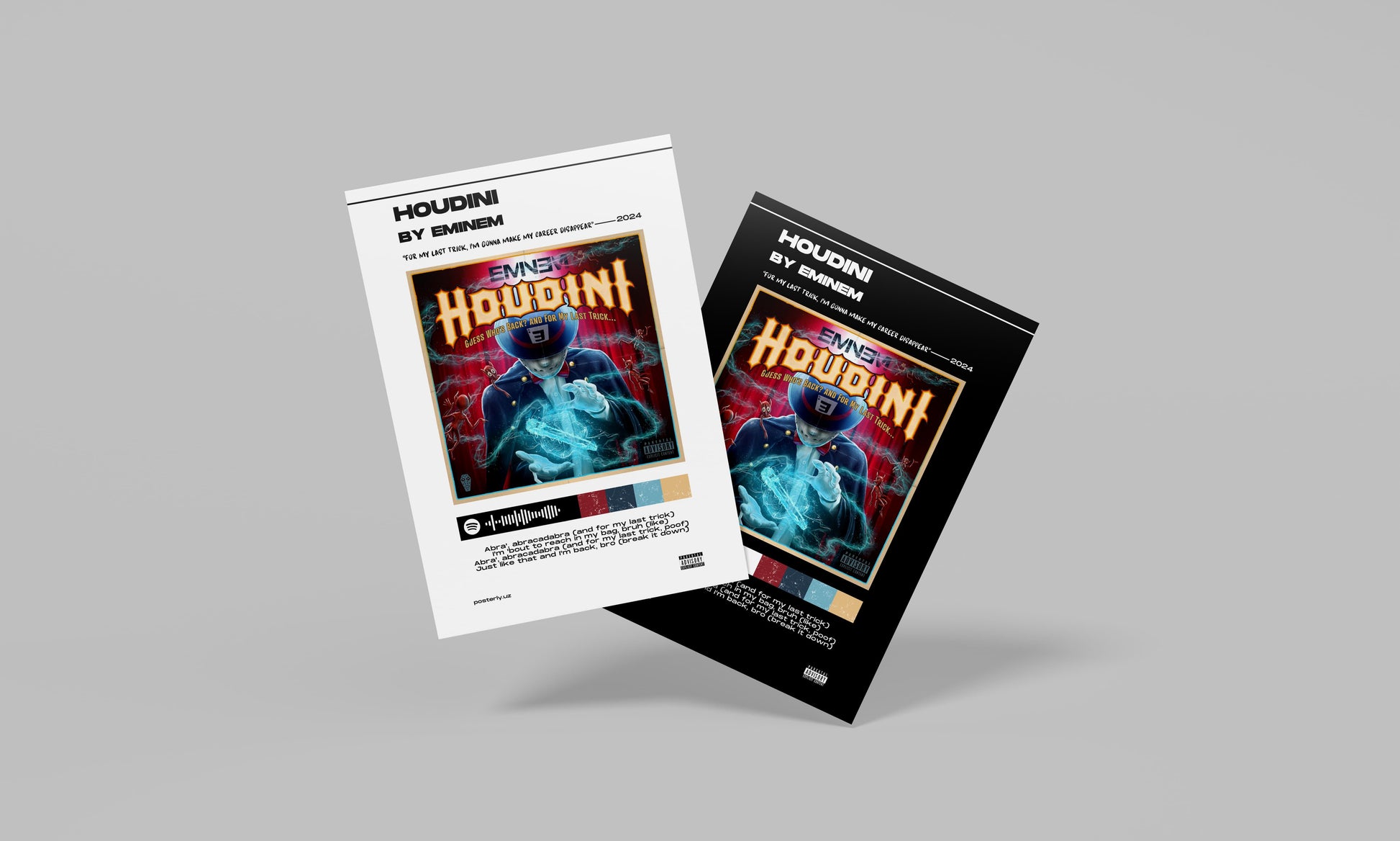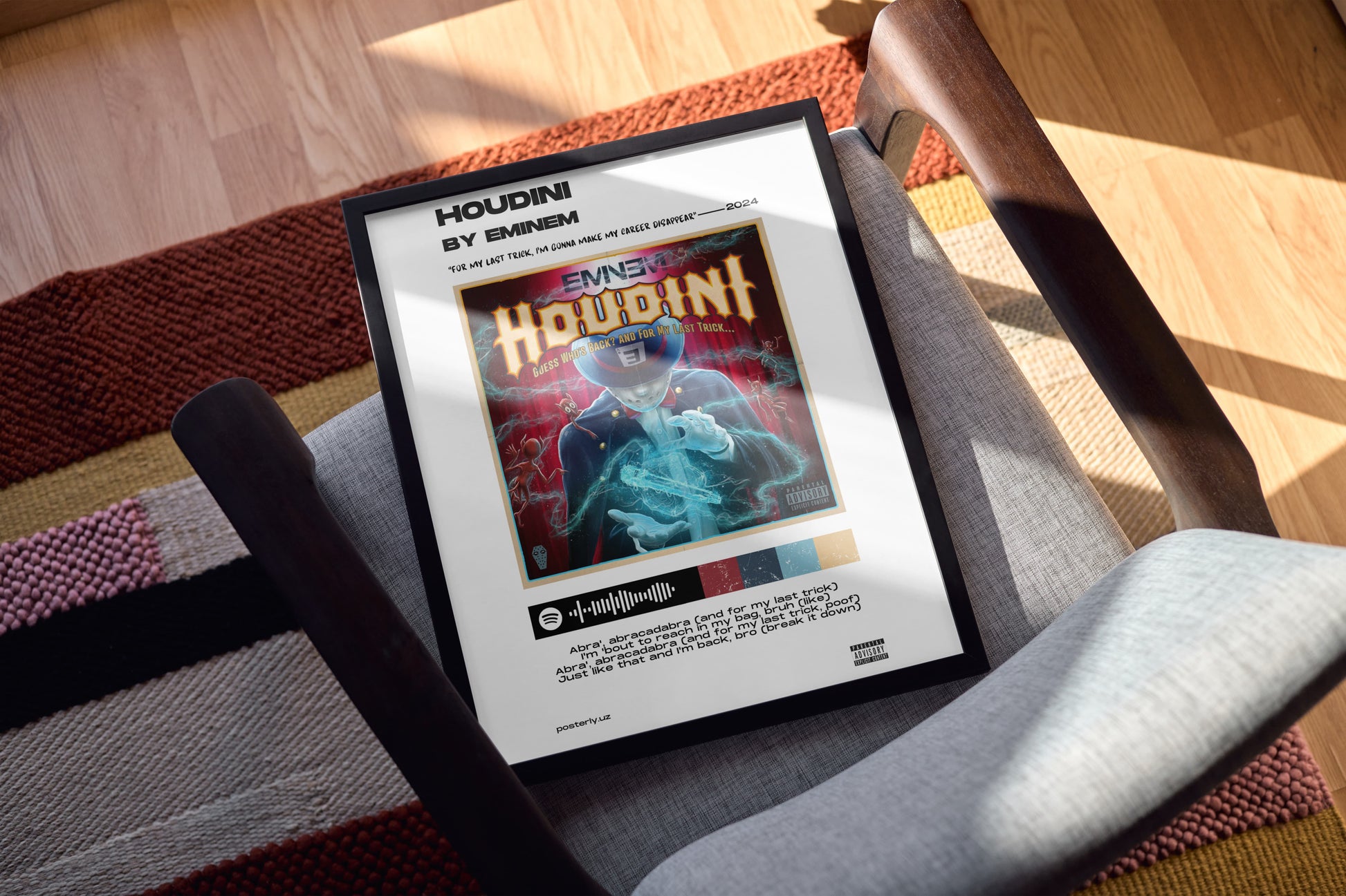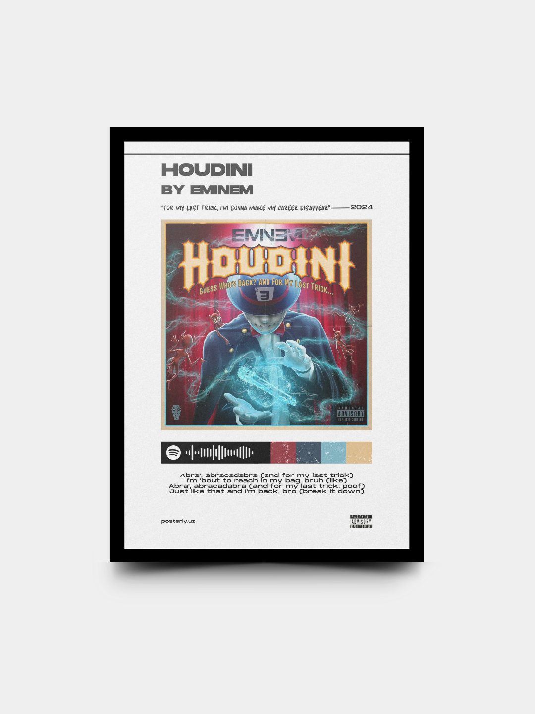 Eminemning dinamik san'atkorligini ushbu Houdini posteri bilan ta'kidlang. Eminem bilan sinonimik bo‘lgan shiddat va lirik jasoratni aks ettiruvchi vizual tasvirlar mavjud bo‘lib, bu yuqori sifatli bosma aniq detallar va uzoq davomiylik beradi. Xip-xopning eng mashhur figuralaridan birining chuqurligi va ta'sirini qadrlaydigan kollektsionerlar va muxlislar uchun juda mos keladi, u har qanday musiqadan ilhomlangan muhitga dadil va murakkab taassurot qo'shadi.