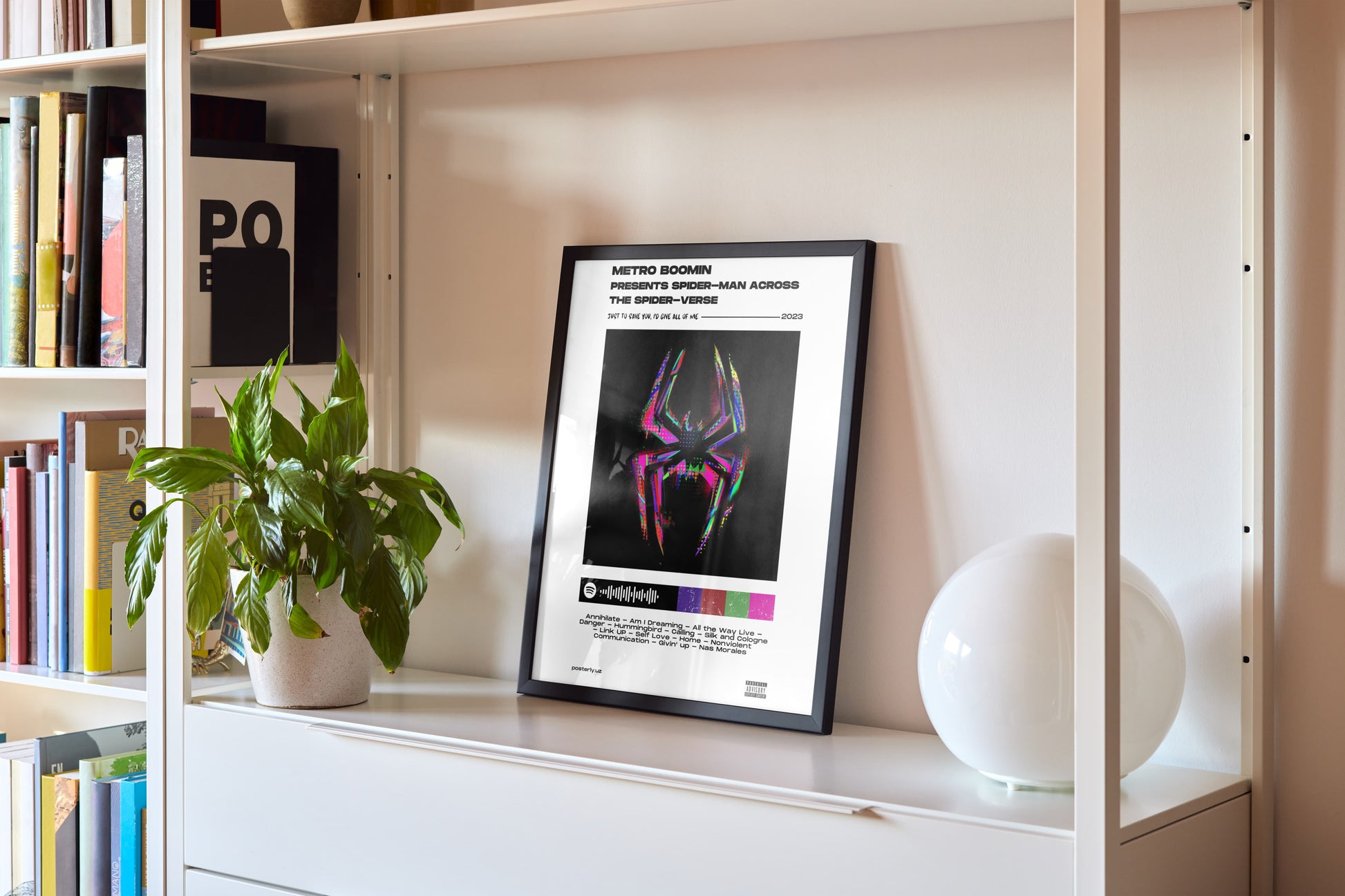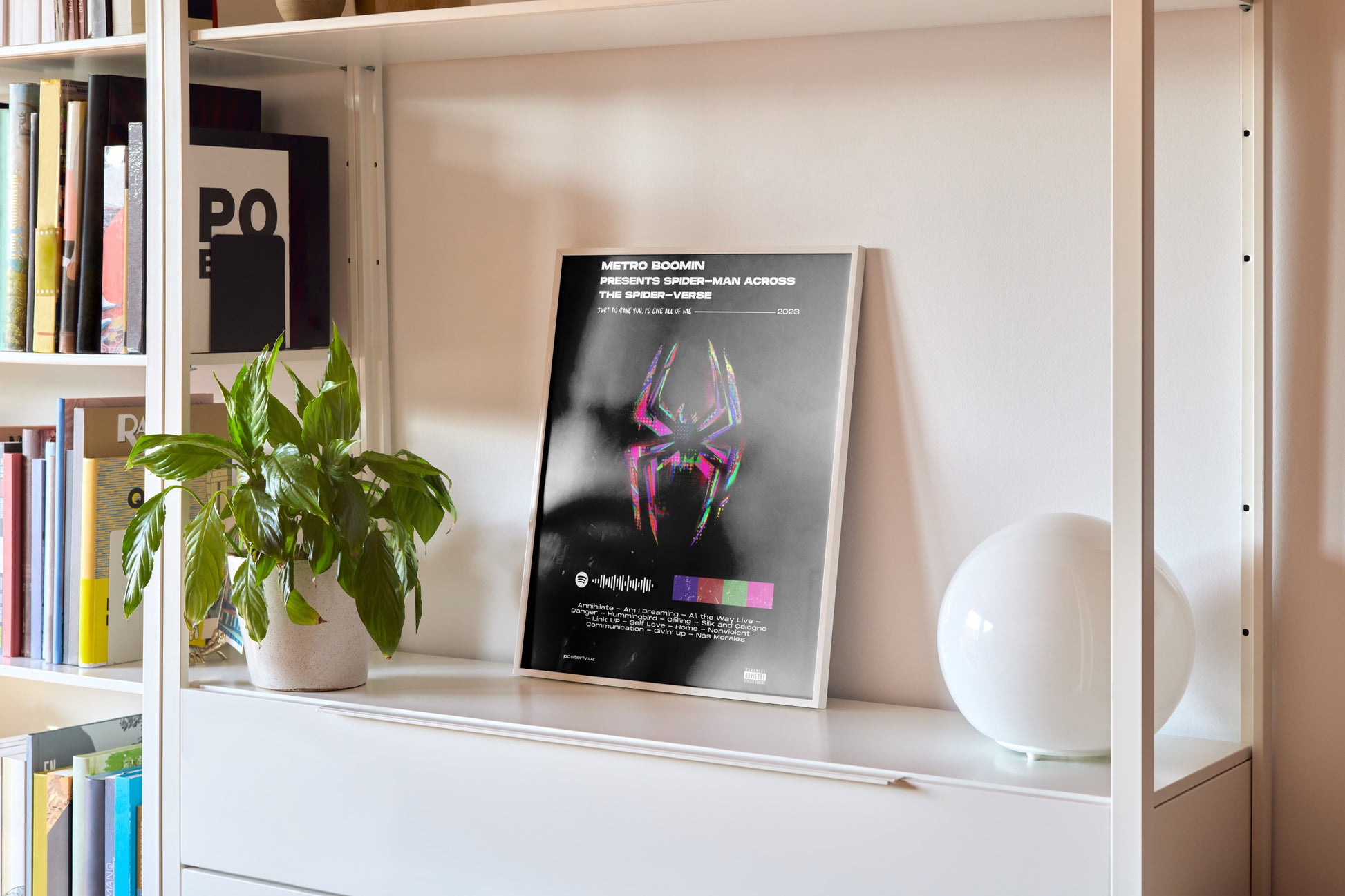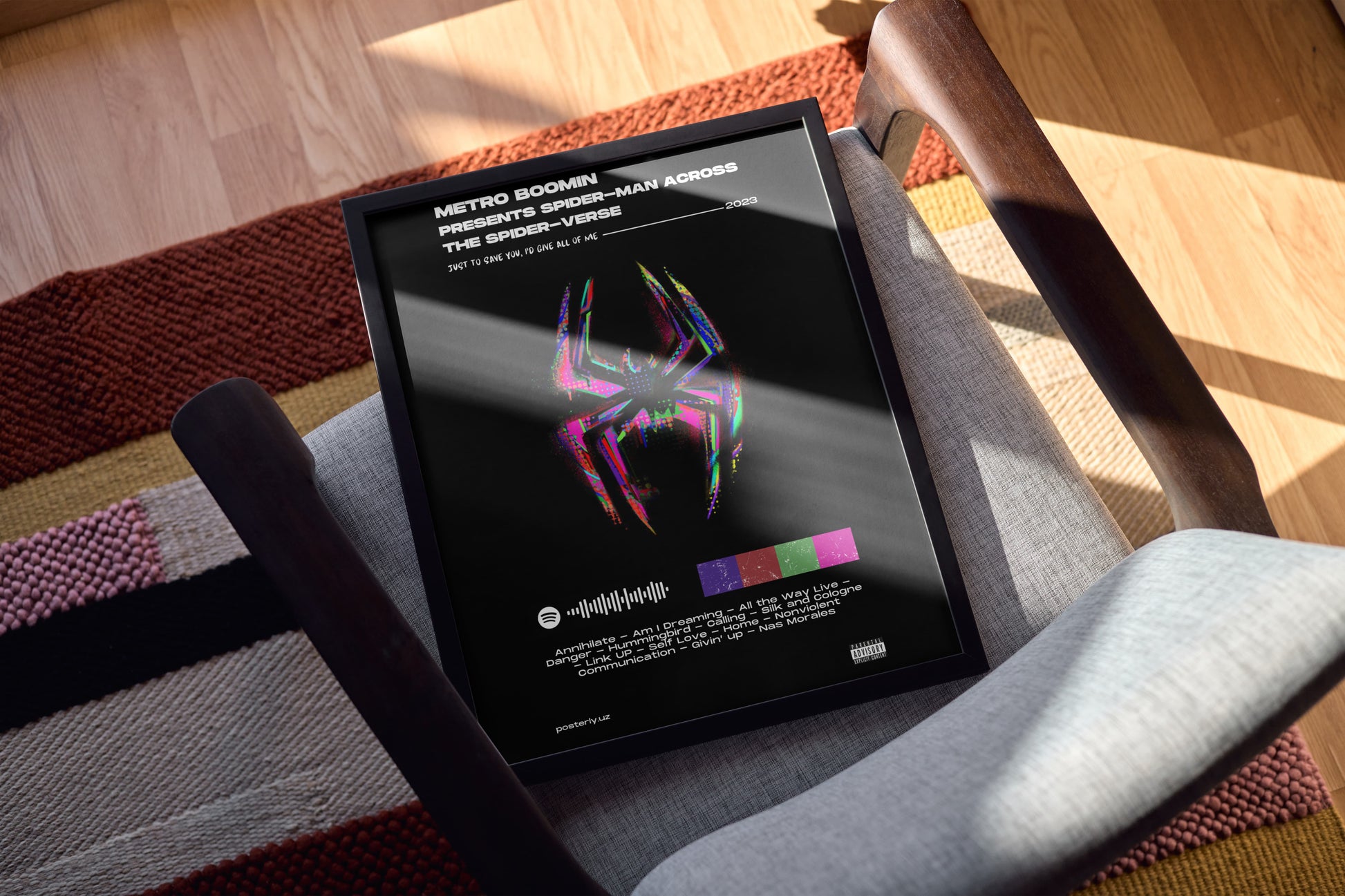Ushbu ajoyib poster Metro Boominning badiiy qarashlari orqali taqdim etilgan ko'p olamdagi O'rgimchak odamning kinematografik olamini ulug'laydi. Zamonaviy vizual hikoya qilishni dinamik dizayn elementlari bilan uyg'unlashtirgan holda, u zamonaviy pop madaniyati va superqahramon muxlislarining mohiyatini aks ettiradi. Kompozitsiya yorqin tasvirlarni murakkab tipografiya bilan birlashtirib, kollektorlar va ixlosmandlar uchun jozibali diqqat markazini yaratadi. Yuqori sifatli bosma texnikalar bilan ishlangan poster yorqin ranglar va uzoq davom etadigan ajoyib ravshanlikni taqdim etadi. Studiyalar, galereyalar yoki maxsus muxlislar uchun mo'ljallangan joylar uchun juda mos bo'lgan ushbu asar O'rgimchak-Verse hodisasi va uning madaniy ta'siriga haqiqiy hurmat sifatida namoyon bo'ladi.